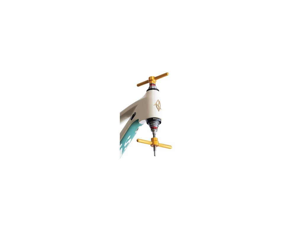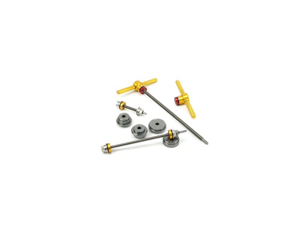 Universal bearing press kit Enduro Bearings BRT-050 for bicycles and e-bikes. Used for pressing bearings in headsets, bottom brackets, hubs, and rear suspension bearings. The set includes 3 threaded rods (in two different diameters), 2 removable handles, and 4 adapters. The adapters are compatible with the longest rod, which has the largest diameter and is intended for pressing headset and bottom bracket bearings. The two shorter rods have a smaller diameter and are intended for pressing bearings into hubs and full-suspension frames. Adapters for the shorter rods are not included in this set.